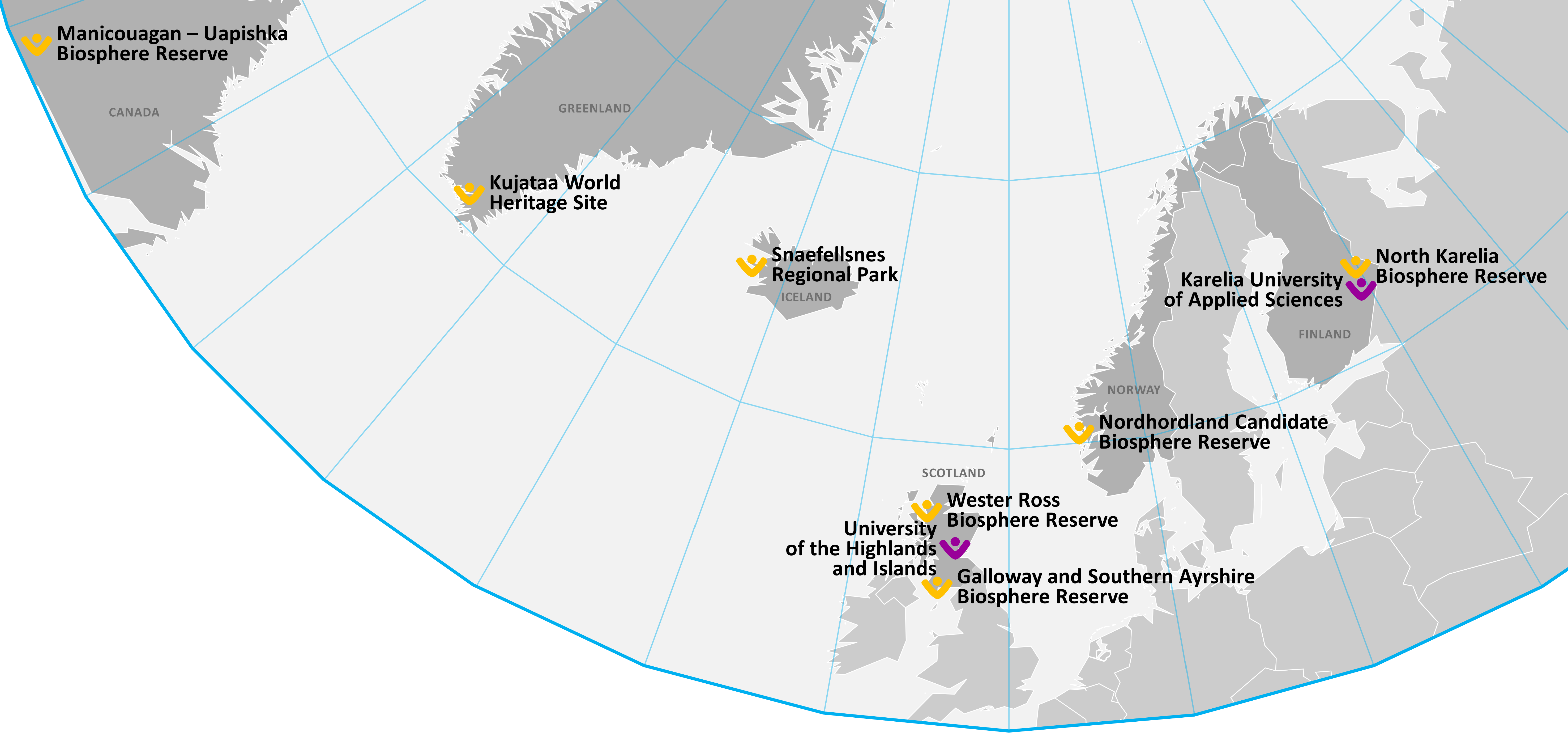 SHAPE project partners were biosphere reserves and regional parks (Sustainable Heritage Areas, or SHAs) and universities from Finland, Norway, Greenland, Iceland  and Scotland  at it involved 33 associated partners from Canada, Faroes, Finland, Greenland, Iceland, Ireland, Northern Ireland, Norway, and Sweden.